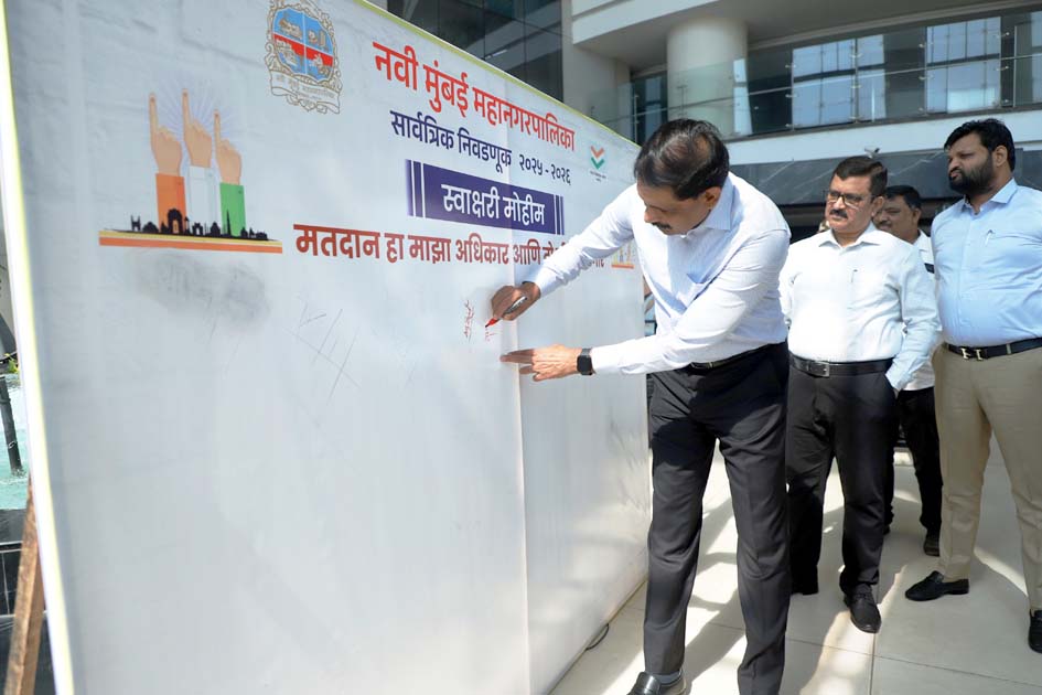 आयुक्त डॉ. कैलास शिंदे यांच्या हस्ते मतदान जागरुकता स्वाक्षरी अभियानाचा शुभारंभनवी मुंबई (प्रतिनिधी) - नवी मुंबई महापालिका सार्वत्रिक निवडणूक २०२५-२६ मधील स्वीप” कार्यक्रमांतर्गत विविध...